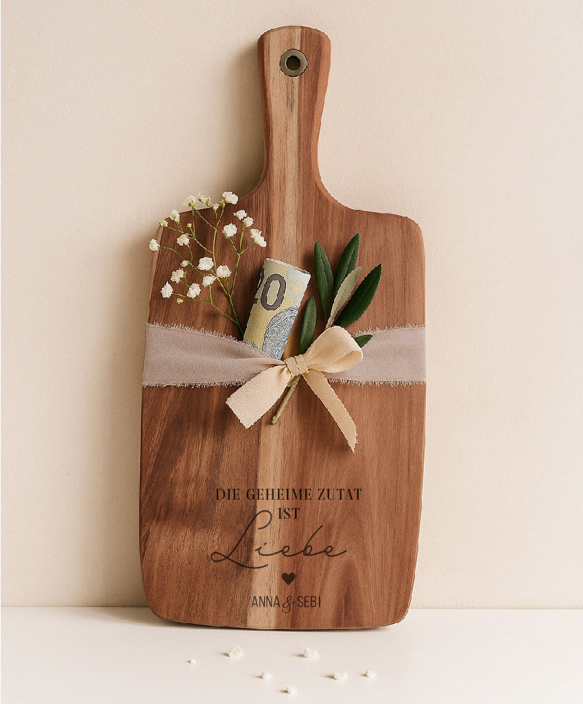 Unser personalisiertes Schneidebrett mit Namen und Datum ist das perfekte Hochzeitsgeschenk für Paare, Verlobte oder frisch Verheiratete.