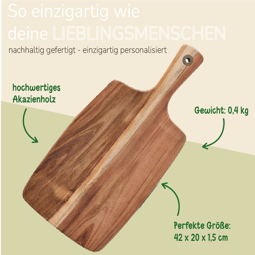Damit dein personalisiertes Schneidebrett aus Akazienholz seine natürliche Schönheit und die Gravur dauerhaft behält, empfehlen wir folgende Pflege:
